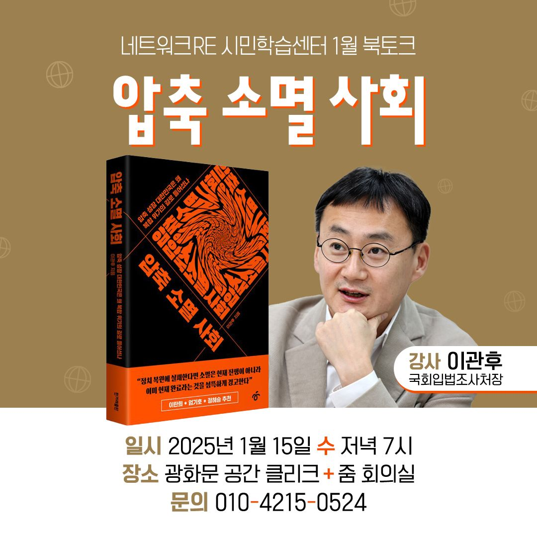 2025년 1월 15일(수) 저녁, 네트워크 RE 시민학습센터에서 최근 <압축 소멸 사회>를 펴낸 이관후 교수(현 국회입법조사처장)님을 모시고 북토크를 진행합니다. 정치학자이자 현직 국회입법조사처장으로서 12.3 내란 사태 이후의 한국 민주주의 위기와 전망에 대해서도 중요한 통찰을 던져 주실 것으로 기대합니다. 많은 관심과 참여를 바랍니다.