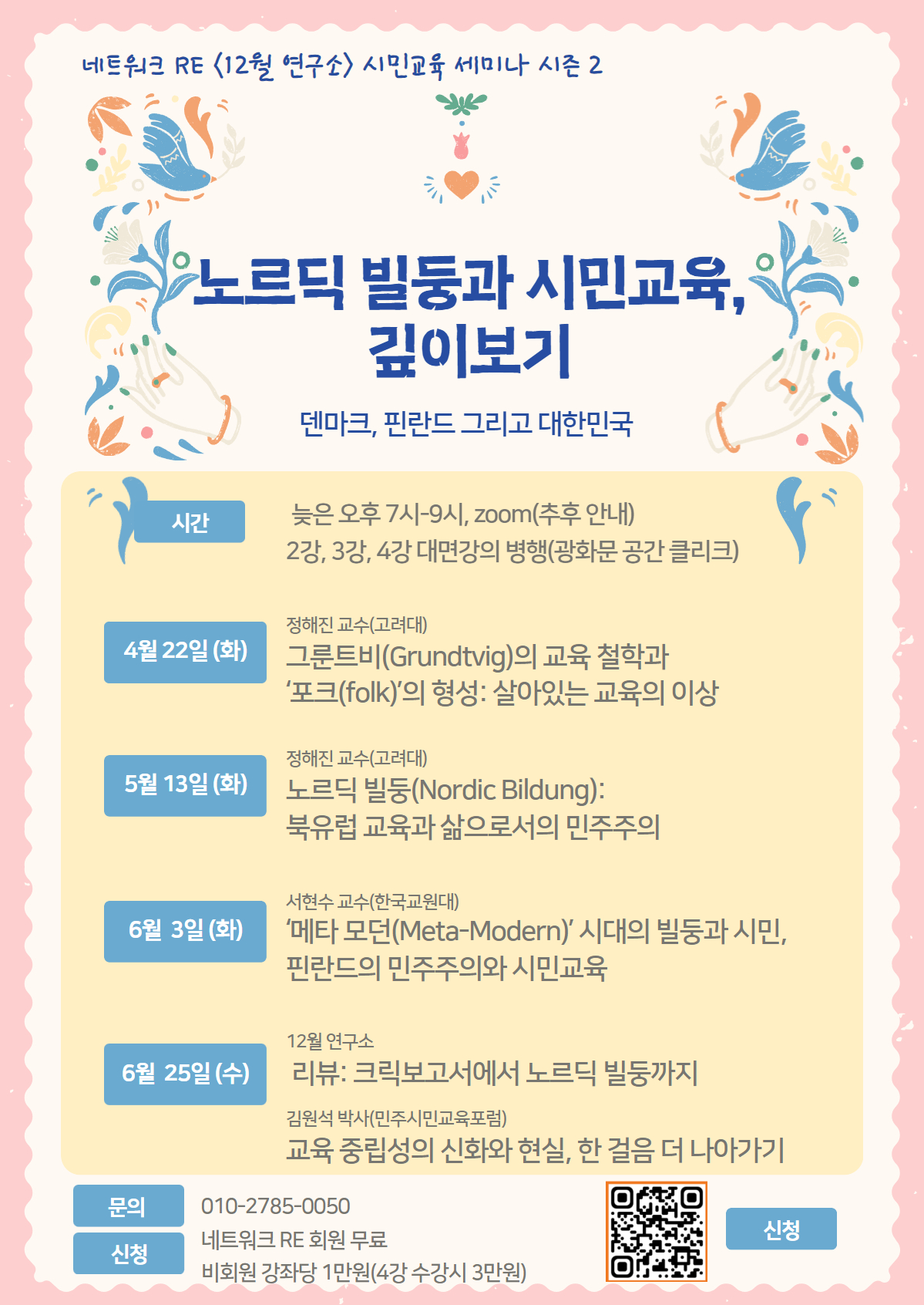 사회적 협동조합 <네트워크RE>의 12월 연구소에서 시민교육 세미나 시즌2를 준비하였습니다. 민주주의, 교육, 시민성 체제의 혁신적 재구성에 관심 있는 연구자, 시민, 교사, 학생들의 적극적인 참여를 바랍니다. 자세한 프로그램과 신청은 아래를 살펴봐 주시기 바랍니다.